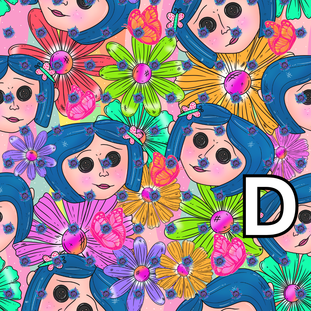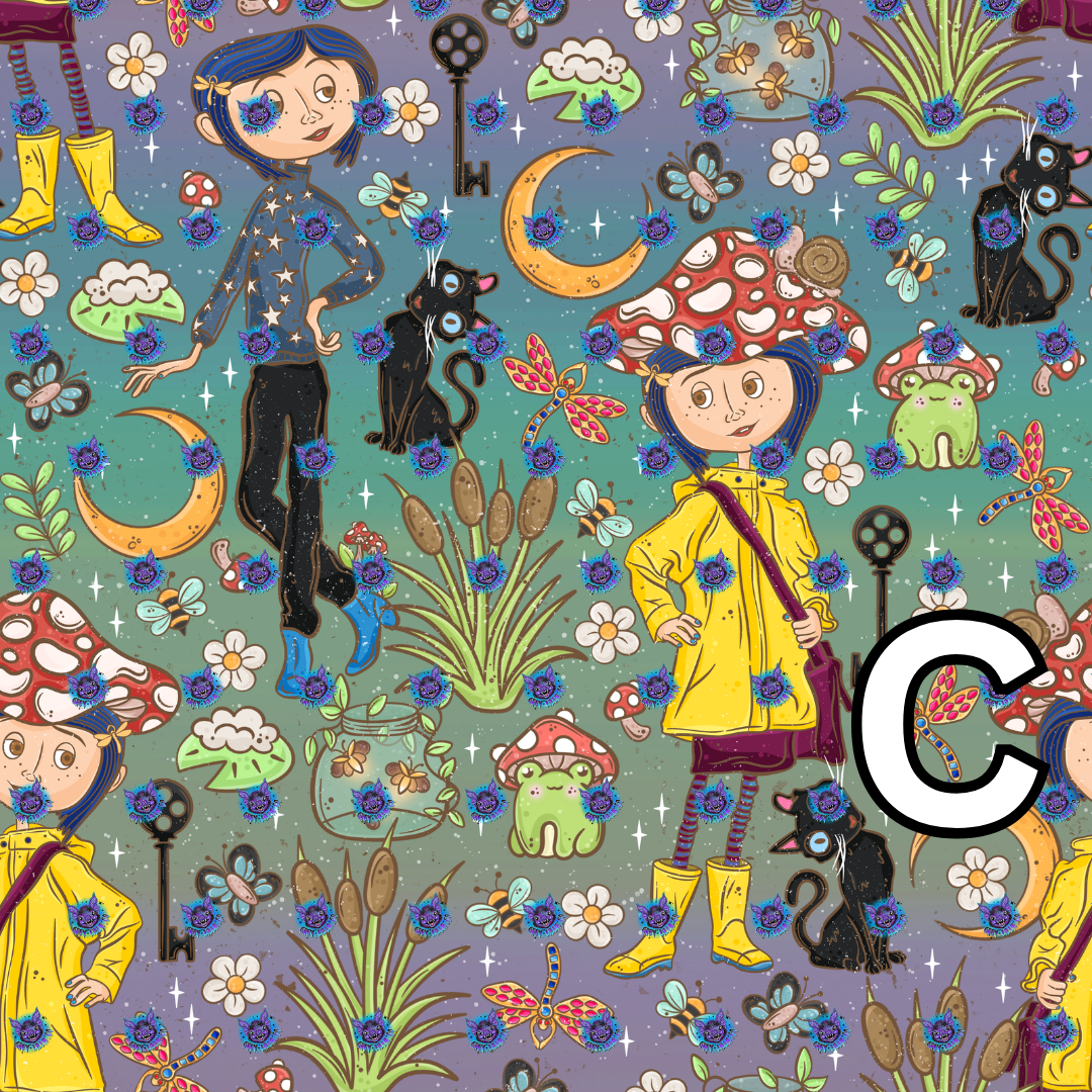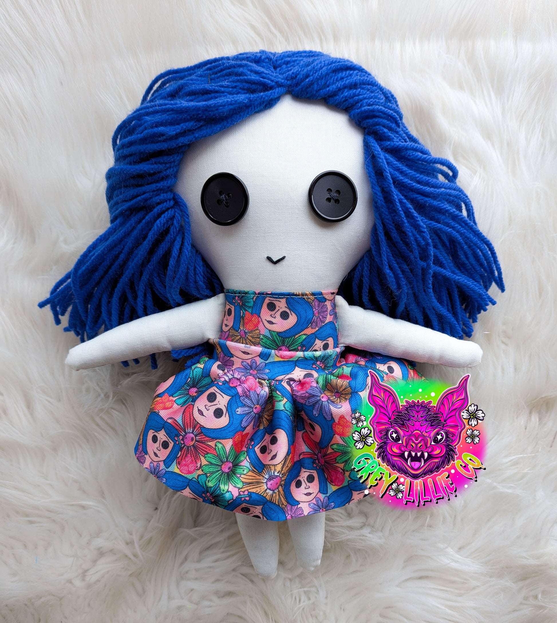 You will be choosing the design used for the dolls skirt and top/body. Coraline dolls will have black button eyes and blue hair. Hair style will be a mystery.